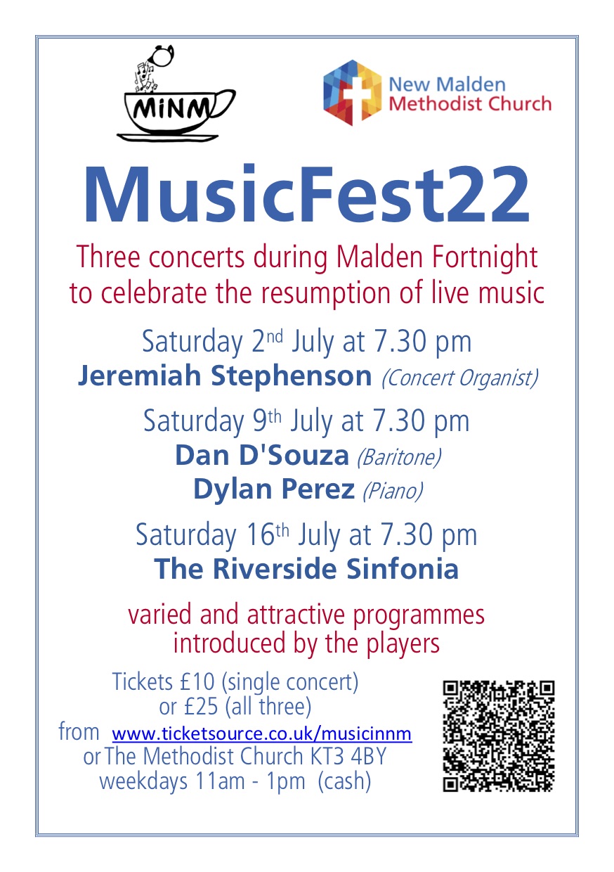 Our third annual MusicFest, in association with New Malden Methodist Church, will take place on the first three Saturdays of July (2, 9 and 16 July).
